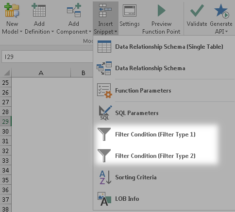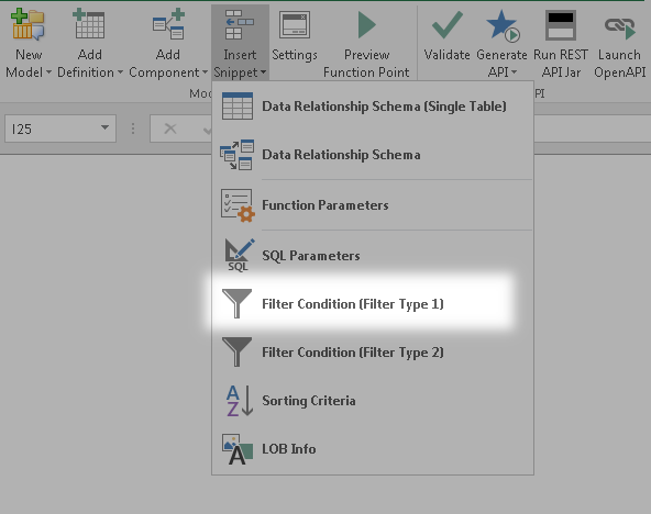 Go to AlchemyJ ribbon and click Insert Snippet. Under the dropdown, select Filter Condition (Filter Type 1) or Filter Condition (Filter Type 2) accordingly.