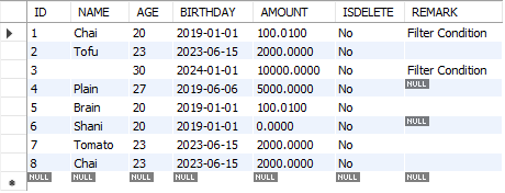 In this example, the default value of Or Group is And . The fields condition in Filter Condition snippet is equal to where condition in SQL statement, total 4 records match in table filter_test1.