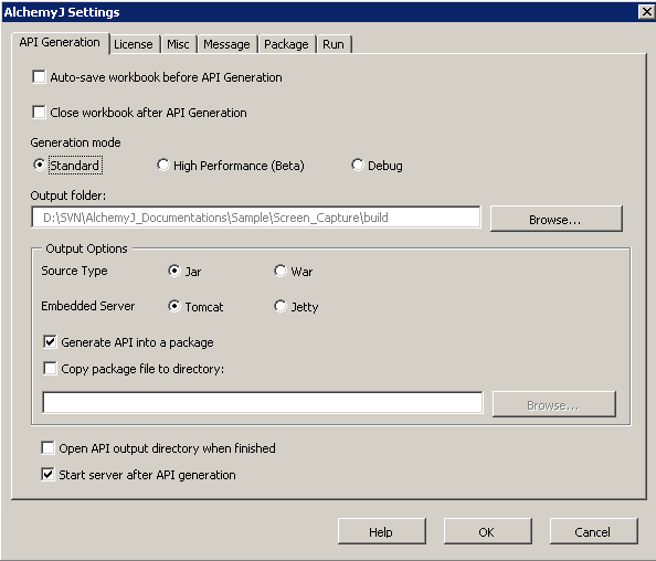 If you want AlchemyJ to generate the Jar package, select Jar as the source type in the API Generation tab of Settings dialog box before clicking Generate API. If you want AlchemyJ to generate the War package, then select War. If it is a REST API, enable the Start Server after API generation and the REST API service will be automatically started as mentioned in Step 4.