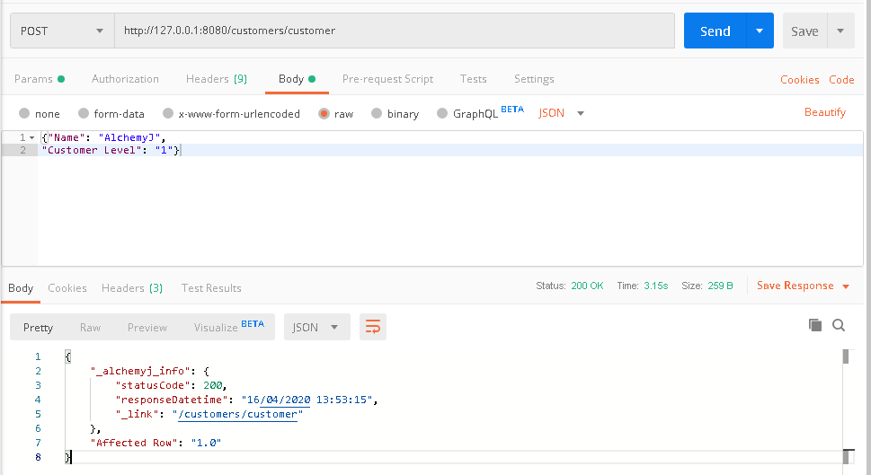 Take the Create Customer as an example, the input is an object and the HTTP method is POST. We use Postman to launch the URL and send the request body as shown below. The creation SQL defined in the business logic will be executed and the status will be returned.