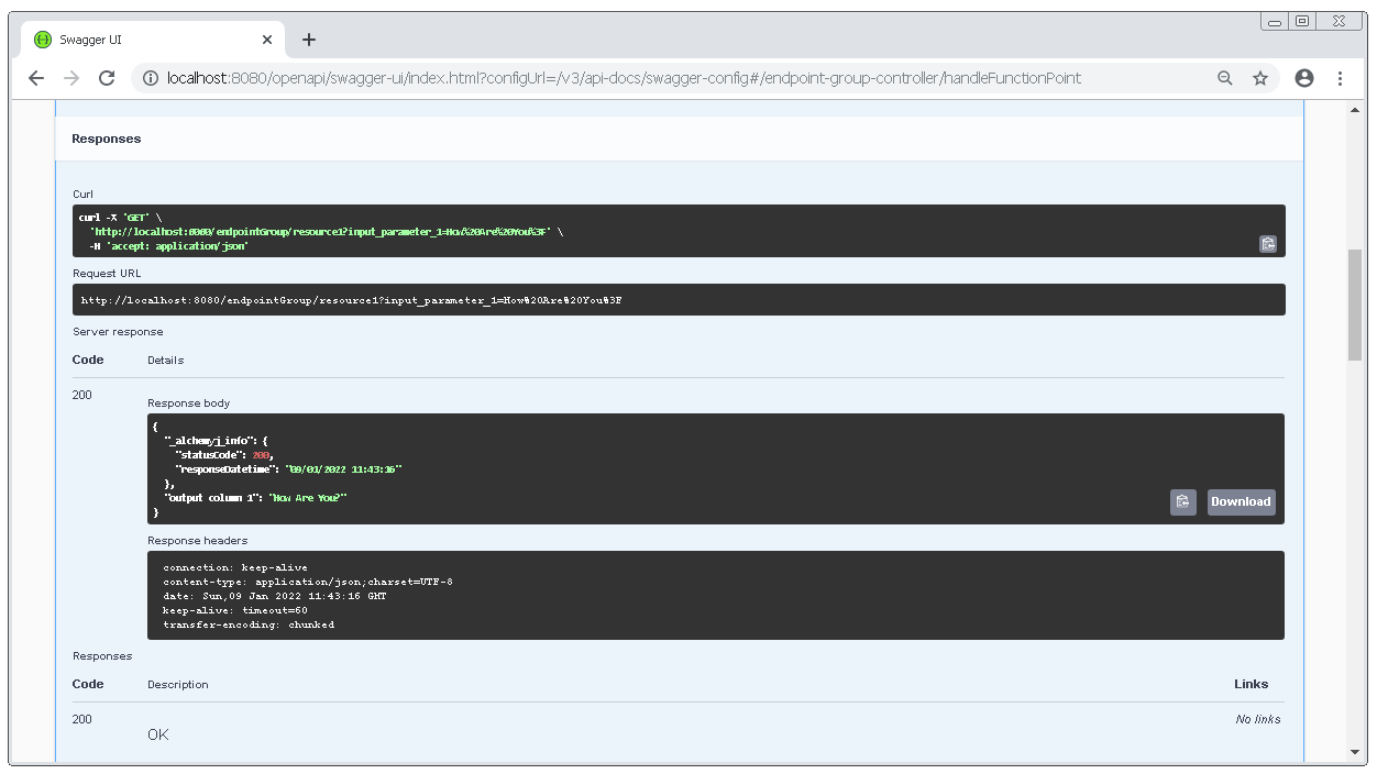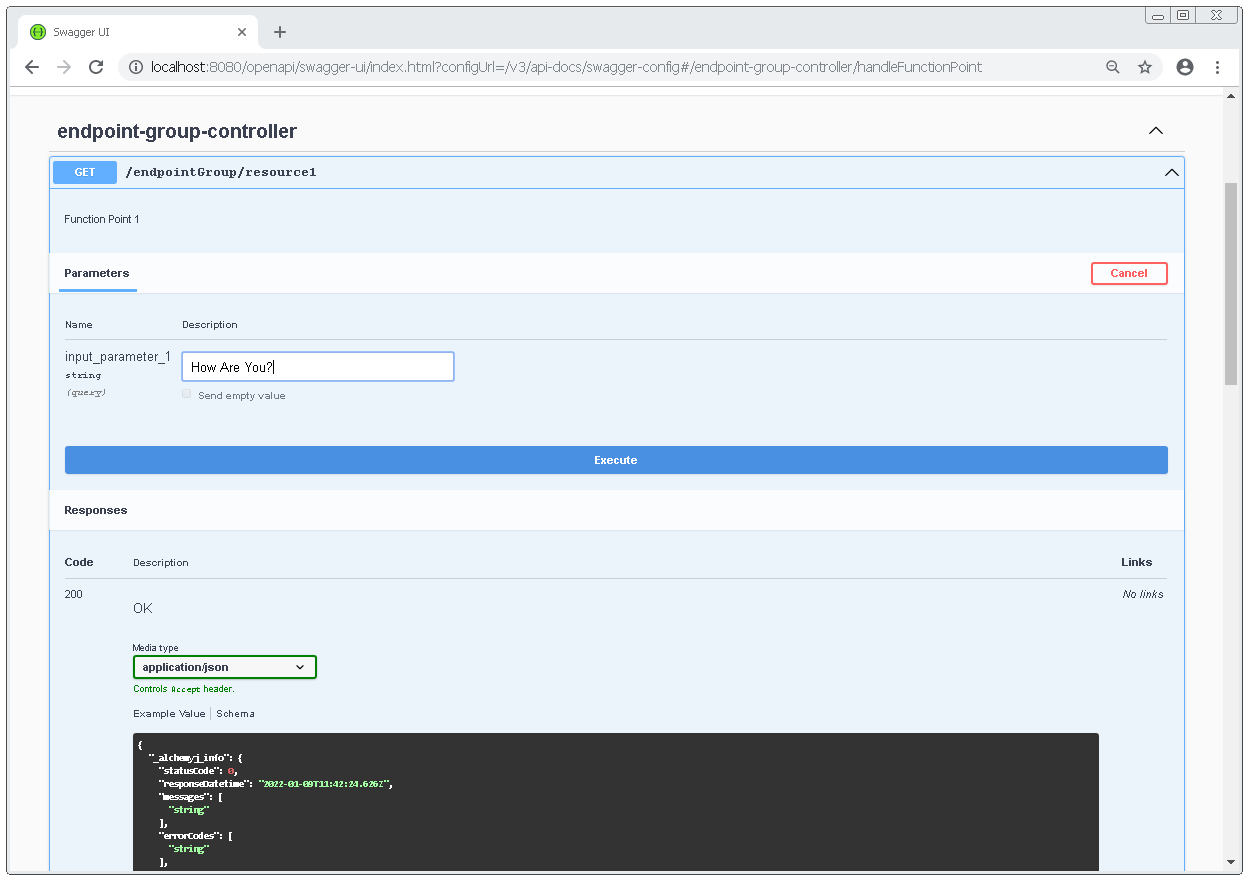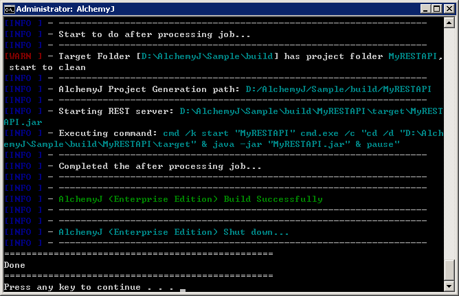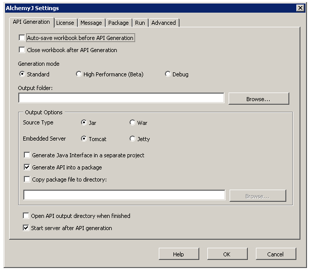 Click Generate API from the AlchemyJ ribbon. After AlchemyJ builds the project, it will run the REST API in the embedded web server. If the server does not start automatically, please check the option "Start server after API generation" on the "API Generation" tab of the Settings window.