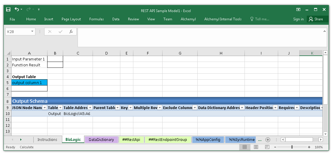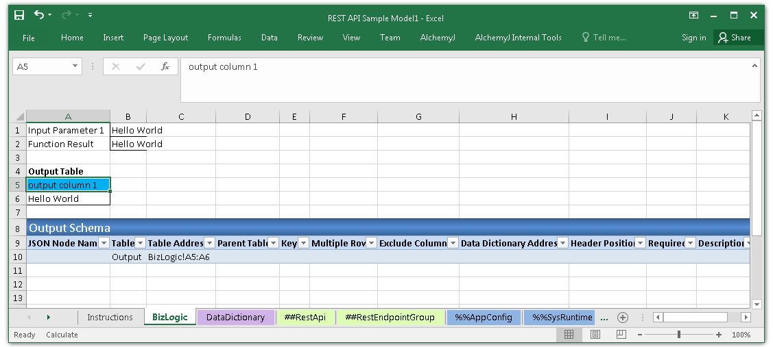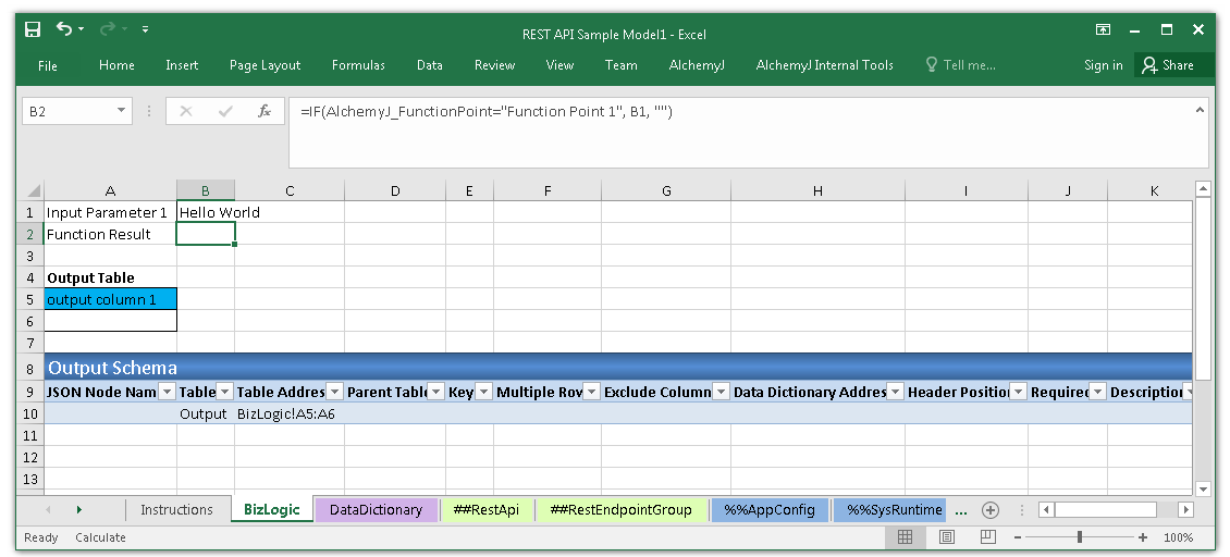 The function point in this sample API puts the output result in B2. The formula of B2 is IF(AlchemyJ_FunctionPoint = "Function Point 1", B1, "") . The condition to check the AlchemyJ_FunctionPoint name is for avoiding the function being triggered repeatedly.