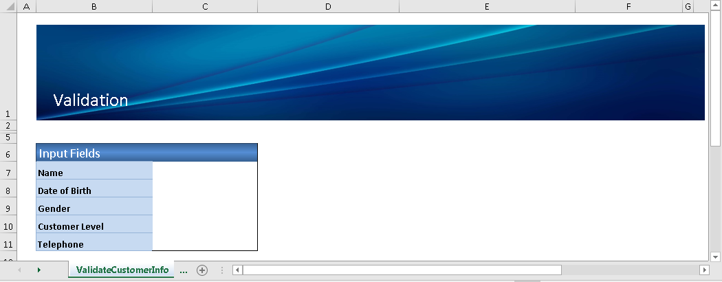 In this example, we will set up a data dictionary and use ajCheckDataItem to validate and transform the input. The model contains a business logic worksheet, ValidateCustomerInfo, which contains cells that holds the input of a customer record. It contains name, date of birth, gender, customer level and telephone.