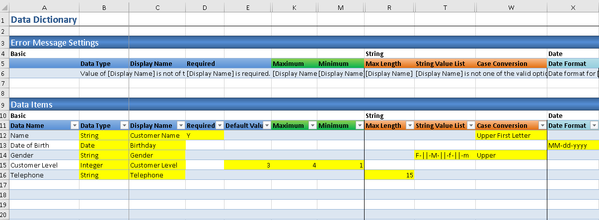 A Data Dictionary worksheet contains two sections. The above section is for error message definition. The below section is a table that contains the data item table. To make this example simple, the error message definition would be left as default. You can change it if you would like to modify the error message returned by ajCheckDataItem.