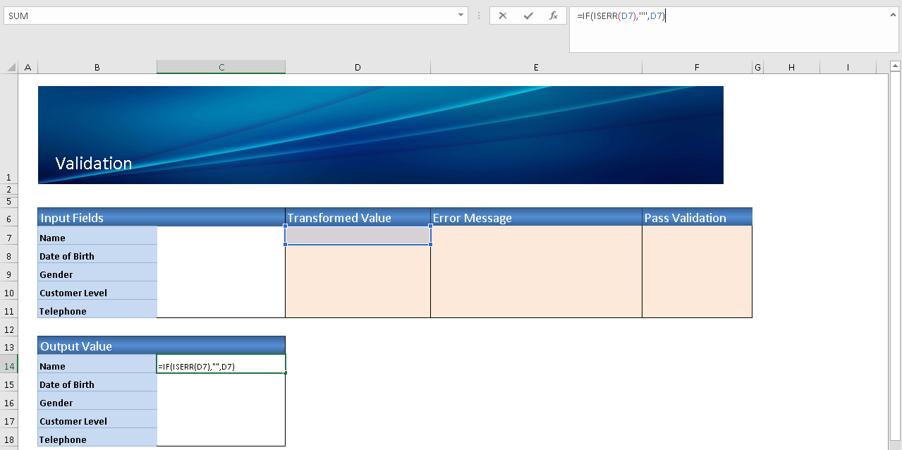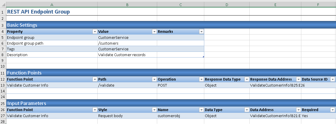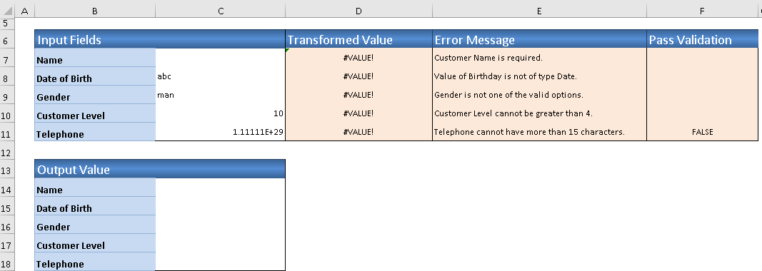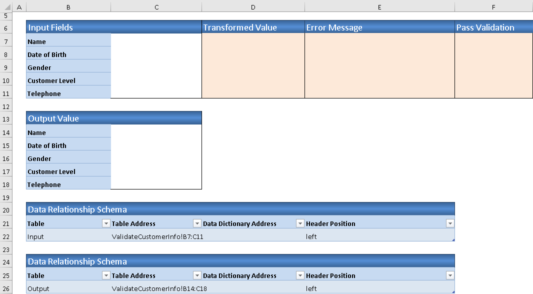 After the data dictionary has been set up, it is time to add the formula to validate the input against the data dictionary. In the ValidateCustomerInfo worksheet, add three columns next to the input fields. These columns will be the output of the ajCheckDataItem function. ajCheckDataItem will return #Value! when it fails the validation. Please note that REST API will encounter error when there has error values in the output range. Thus, we add a output table and using IFERROR formula to replace error with empty string.