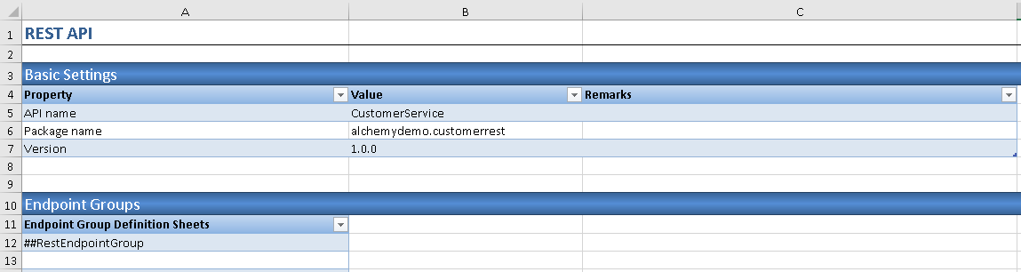 Click Add Definition button in AlchemyJ ribbon, select REST API to add ##RestApi worksheet. Provide the API name, Package name and Versions in Basic Settings and add the REST API Endpoint Group worksheet name in the Endpoint Groups section.