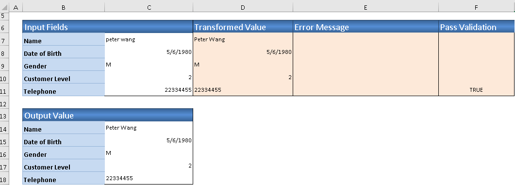 Below is an example of input values that can pass validation. Name has been converted to title case capitalization and Gender has been converted to upper case. The third return column will be TRUE means all input values are valid.