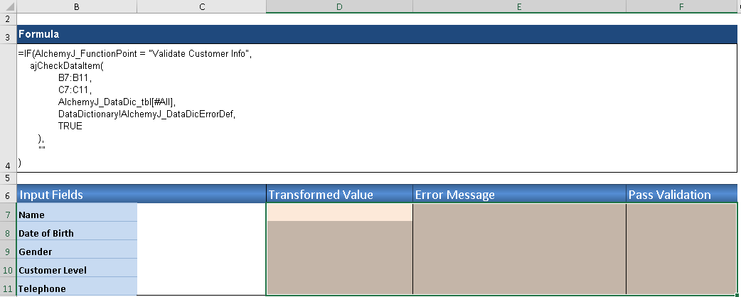 ajCheckDataItem(Header, Data, Data_dictionary, [Error_definition], [Transform])Parameter Value Header Put the field name range here which is B7 to B11. Data Put the field value range here which is C7 to C11. Data_dictionary Put the name of the data dictionary configuration table here. The name of the data dictionary is AlchemyJ_DataDic_tbl[#All]. Alternatively, use ajAddress and select the range of the data dictionary table. Error definition Put the name of the error definition configuration table here. The name of the Error definition is DataDictionary!AlchemyJ_DataDicErrorDef. Alternatively, use ajAddress and select the range of the error configuration table in the data dictionary worksheet. Transform Put TRUE here since we have defined Case Conversion for Name and Gender. As ajCheckDataItem returns a range of values, it should be set as an array formula. Select cell D7:F11, input the following formula as shown in B4 and press CTRL+ SHIFT+ ENTER to make it become an Array Formula. Note that an IF function with the condition, AlchemyJ_FunctionPoint="Validate Customer Info", is used to make sure ajCheckDataItem will only run when function point Validate Customer Info is run.