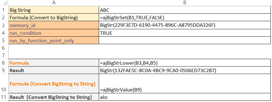 To verify the result, we can use the ajBigStrValue formula in B10 to make it into a normal String. As seen in B11, we have successfully transformed the Big String into lower case which is 'abc'.