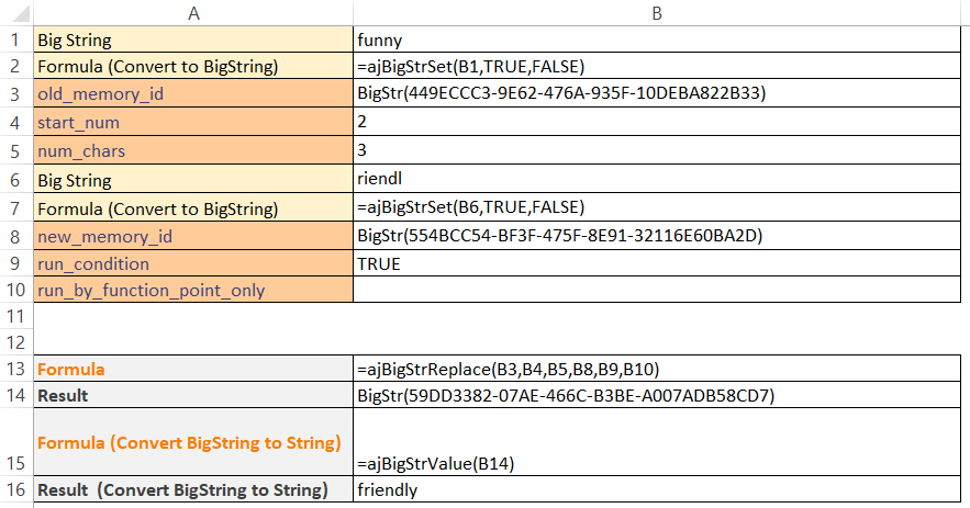 To verify the result, we can use the ajBigStrValue formula in B15 to make it into a normal String. As seen in B16, we have successfully transformed the word from 'funny' to 'friendly' by replacing part of the Big String.