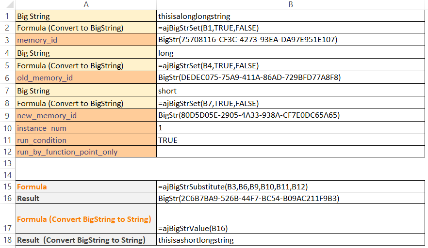 To verify the result, we can use the ajBigStrValue formula in B17 to make it into a normal String. As seen in B18, we have successfully transformed the word from 'thisisalonglongstring' to 'thisisashortlongstring' by replacing part of the Big String.