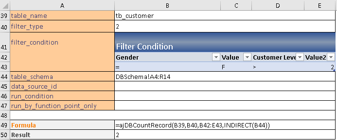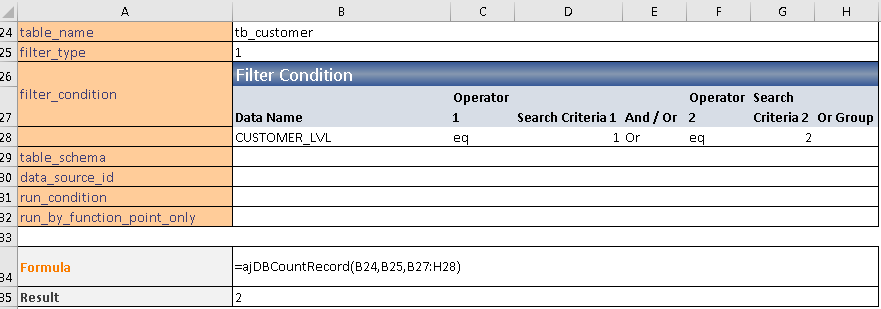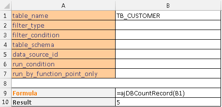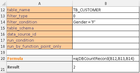 The ajDBCountRecord function counts the number of records in a database table satisfying the criteria specified in filter_condition. Please take note that to run this function from Excel, you would need to set up the Data Source Connection in ##ExternalResources.