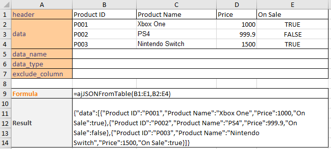 | data (required) | Range / Array | The range of cells to be set as the value of the JSON name-value pair. It can be selected either vertically or horizontally but the orientation must be the same as ‘Header’. |