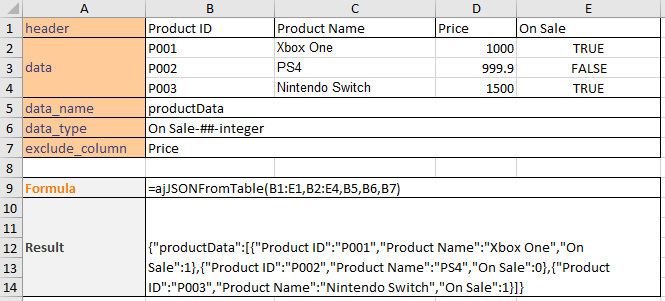 For below case, customize the data_name as productData, and set the On Sale data type is string and Price data type is integer. exclude_column is Product Name, so after generate json the node name is productData, the On Sale data type is string, the Price data type is integer, and the Product Name will exclude in the json.