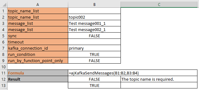 | message_list (required) | Range | The content of Kafka message from a range of cells. The range of cells can span multiple rows and columns, the content in cells that are in the same row will be concatenated. |