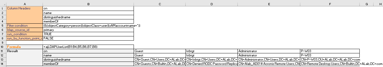Do remember to copy the formula in Cell B10 and make into a cell array formula across the required cells. In this case, it is made into a cell array formula across cells C11:F14. As you can see from the example above, after running the function point, it returns the LDAP user list.