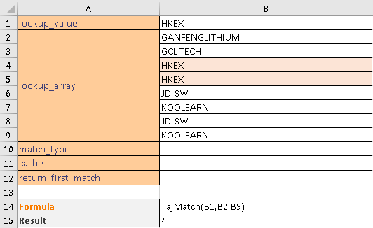 | cache (optional) | Boolean | TRUE means to cache the lookup_array range. Subsequent ajMatch call to the same range will get the lookup_array from cache instead. With the cache enable, the performance will be much better than Excel Match() when the same range is used for matches many times in a function point. FALSE means will not use cache. The default value is False. |