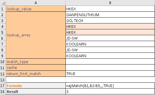 ajMatch(lookup_value, lookup_array, [match_type], [cache],[return_first_match])