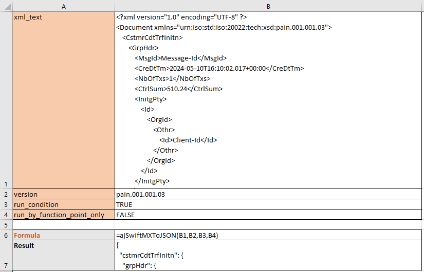 =ajSwiftMXToJSON(B1:B2,B3,B4,B5)