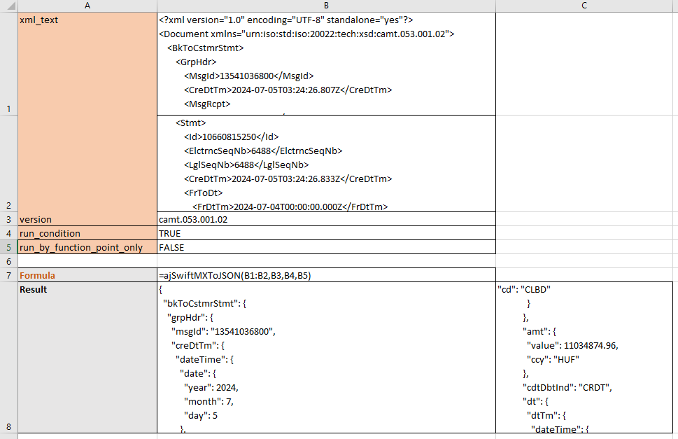The ajSwiftMXToJSON function can convert the SWIFT MX message to JSON string, it only supports ISO 20022 standard. This is an example for SWIFT MX message.