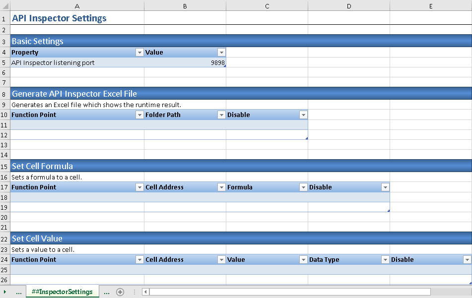 A new worksheet ##InspectorSettings will be added to the workbook. In the ##InspectorSettings, each section represents an inspector action.